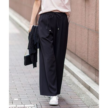こなれた印象を演出するトロミ素材のワイドパンツ