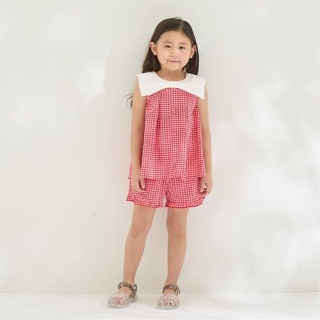 四角いリボン衿がかわいいブラウス&フリルハーフパンツのセットです