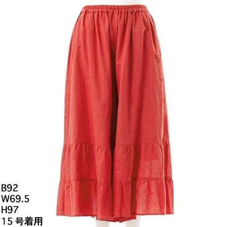 [型番:46160062]綿麻ボイルワッシャーを使用したティアードパンツ。ナチュラルなシワ感と軽やかな風合いが魅力で、ふんわり揺れるティアード切り替えが女性らしさを演出します。ブラウスやTシャツとのコーディネートはもちろん、ワンピースの裾からティアードのフリルを覗かせるスタイリングもおすすめです。季節感のある、リラックス感漂う一枚に仕上げました。ウエストはゴム&紐で快適な履き心地。裏地付きなので、一枚で涼しくご着用いただけます。