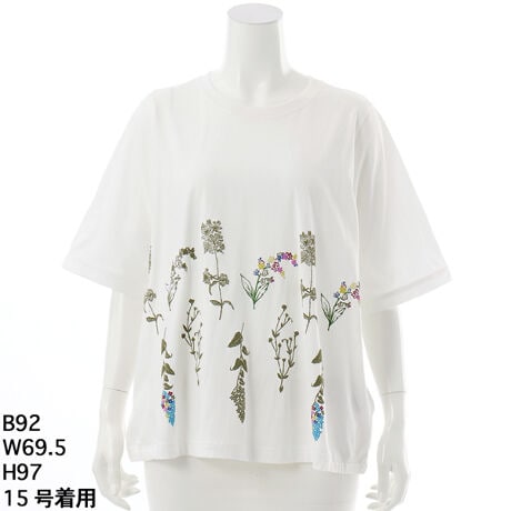 [型番:46950562]発泡プリントを施し、刺繍のように仕上げたデザインTシャツ。単色のプリントの中に、彩り豊かな花々がポイントで咲く柄です。両サイドの裾には布帛をあしらい、裾にゴムを入れてふんわりとしたボリュームを出しました。ベーシックなカラー展開で、コーディネートに取り入れやすい一枚です。