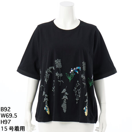 [型番:46950562]発泡プリントを施し、刺繍のように仕上げたデザインTシャツ。単色のプリントの中に、彩り豊かな花々がポイントで咲く柄です。両サイドの裾には布帛をあしらい、裾にゴムを入れてふんわりとしたボリュームを出しました。ベーシックなカラー展開で、コーディネートに取り入れやすい一枚です。