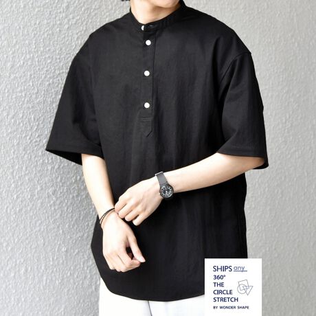 SHIPS any: 360° THE CIRCLE STRETCH リネン混 バンドカラーシャツ◆