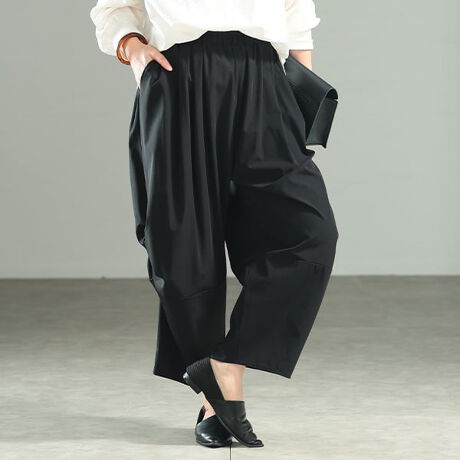 ゆったりとした穿き心地と、計算されたシルエットが魅力の一本。ウエストは総ゴム仕様で締め付け感がなく、ストレスフリーに着用できます♪腰まわりから裾にかけては、タックと立体的な切り替えでほんのり丸みのあるコクーンシルエットに◎脚のラインを拾わず、自然に体型カバーしながら、すっきりとした印象を演出します。
