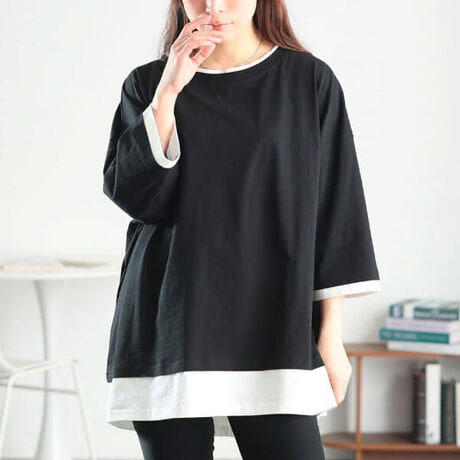 綿100%&ひんやりタッチで快適着心地☆冷感後ろスリット重ね着風コットンプルオーバー登場!ワイド身幅とリラクシーなドロップショルダーでゆったり着れるオーバーシルエット◎こなれ感のあるサイズ感を味方にワンツーコーデが垢抜けます!首元・袖口・裾の配色切り替えで重ね着風のお洒落なアクセントをON☆後ろスリットがお洒落心をくすぐる印象的な後ろ姿に!
