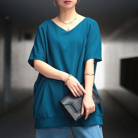 ベーシックなプルオーバーで、コーデに投入しやすい万能さが嬉しい一着。光沢を感じさせる質感が高見え効果に。ラフ感のあるシルエットでカジュアルはもちろんのこと、綺麗めなボトムスとも相性抜群。デイリーからオフィスなど幅広いシーンで活躍します。ゆったりとしたドルマンシルエットで体型を拾わず、落ち感のある生地で華奢見えに。広めのVネックが顔周りをすっきりさせつつ、デコルテ映えする首元を演出します。安心のチュニック丈で気になるヒップもカバーし、裾リブ風切り替えで全体にメリハリをプラス。