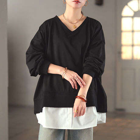 裏毛仕様のスウェット生地と、布帛生地を裾にドッキングしたレイヤード風デザインのトップス。ラフさがありながらも、裾からのぞく布帛生地がきちんと感と、大人っぽさを演出します。カジュアルから綺麗めボトムスとの相性も抜群。着回し力の高い万能さも嬉しいポイント。ゆったりとしたサイジングと、ヒップを隠してくれる安心丈で、ボディラインを拾うことなく、着るだけで体型カバーに。Vネックの首元がデコルテを美しく見せつつ、顔周りをすっきりに。裾の切り替え部分に動きを加え、重たく感じさせず、立体感のあるシルエットに。