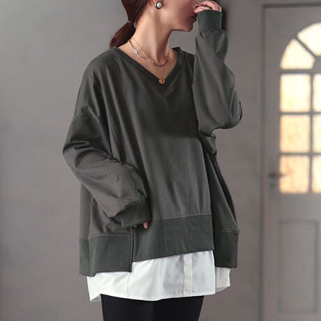 裏毛仕様のスウェット生地と、布帛生地を裾にドッキングしたレイヤード風デザインのトップス。ラフさがありながらも、裾からのぞく布帛生地がきちんと感と、大人っぽさを演出します。カジュアルから綺麗めボトムスとの相性も抜群。着回し力の高い万能さも嬉しいポイント。ゆったりとしたサイジングと、ヒップを隠してくれる安心丈で、ボディラインを拾うことなく、着るだけで体型カバーに。Vネックの首元がデコルテを美しく見せつつ、顔周りをすっきりに。裾の切り替え部分に動きを加え、重たく感じさせず、立体感のあるシルエットに。