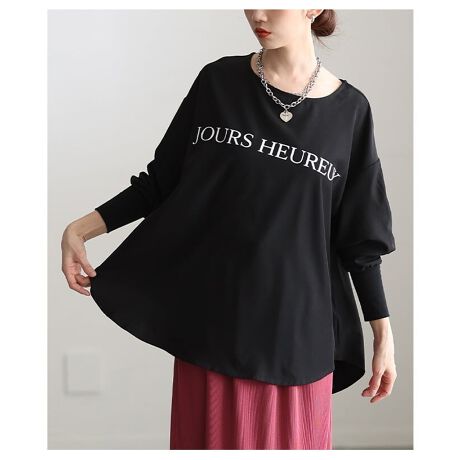 ロゴデザインが目を惹くチュニックトップス。裾のラウンドデザインとゆったりしたドルマンシルエットで、気になる体型もさりげなくカバー。ラフに着るだけでこなれた印象に仕上がる一枚です☆