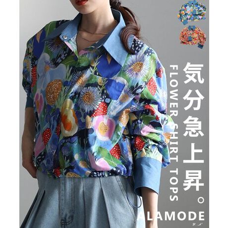 鮮やかな花柄が気分をぐっと明るくしてくれるシャツトップス。裾のドローコードでシルエット調整ができ、その日の気分やコーデに合わせて着こなしを楽しめます。主役として活躍する一枚です!