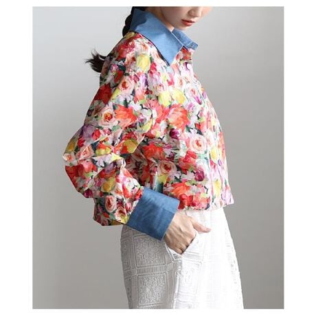 鮮やかな花柄が気分をぐっと明るくしてくれるシャツトップス。裾のドローコードでシルエット調整ができ、その日の気分やコーデに合わせて着こなしを楽しめます。主役として活躍する一枚です!