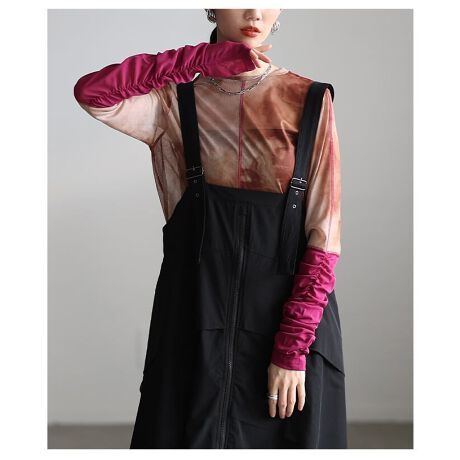 アクセントカラーの配色とタイダイ模様が目を惹くシアートップス。袖口にかけてギャザーを寄せたクシュっとした表情がアクセントに。軽やかな透け感でレイヤードにもぴったりな、着こなしの幅が広がる一枚です☆