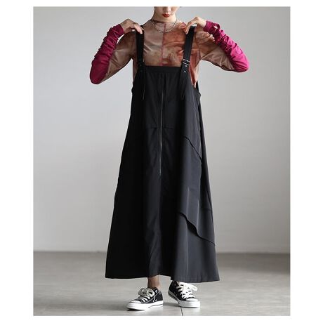 フロントジップがアクセントのサロペットスカート。チュールレースを重ねたデザインで、軽やかさとモードさをプラス。インナー次第で印象が変わり、幅広いコーデが楽しめる一枚です☆