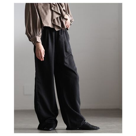 ストライプ柄がすっきりとした印象を与えるイージーパンツ。縦ラインでスタイルアップ効果もあり、ラクな穿き心地なのにきちんと見えが叶います。デイリーに使いやすい一本です☆
