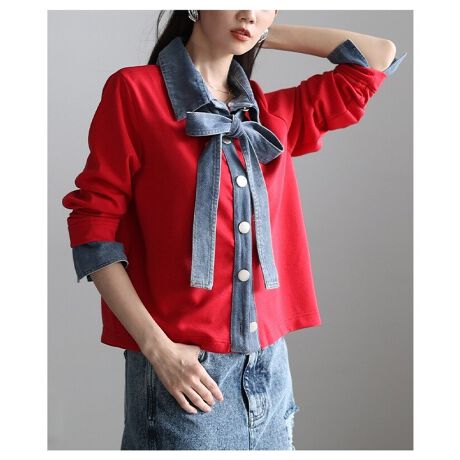 【トップス】 シャツ カーディガン 異素材 スウェット デニム リボンタイ 長袖 赤 グレー 紺