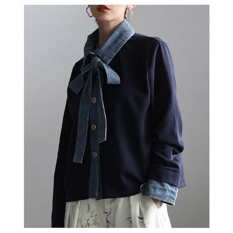 【トップス】 シャツ カーディガン 異素材 スウェット デニム リボンタイ 長袖 赤 グレー 紺