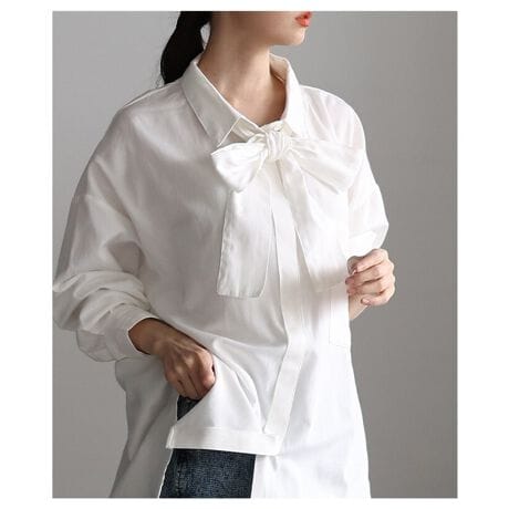 上品に決まるボウタイブラウス。襟の後ろにループが付いているので、リボンがずれにくくきれいな形をキープできるのが嬉しいポイント。きちんと感と華やかさを両立できる一枚です☆