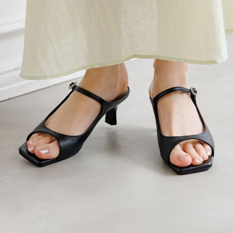 大きくカットアウトされた甲のデザインが女性らしさを演出するミュールサンダル。繊細なビジューバックルが、足元に華やかなアクセントを添えます。