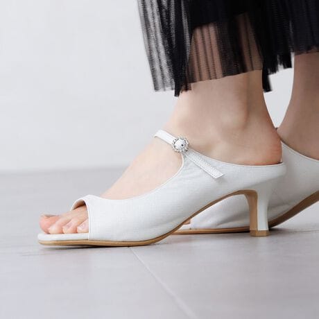 大きくカットアウトされた甲のデザインが女性らしさを演出するミュールサンダル。繊細なビジューバックルが、足元に華やかなアクセントを添えます。