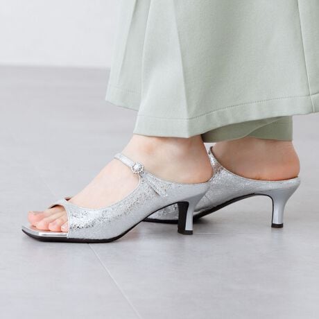 大きくカットアウトされた甲のデザインが女性らしさを演出するミュールサンダル。繊細なビジューバックルが、足元に華やかなアクセントを添えます。