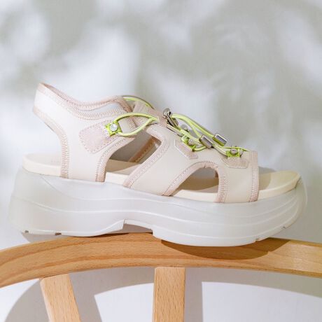 メタリック素材と細かなビジュー飾りで女性らしくカジュアルすぎない大人のスポーツサンダルです。フロント部分のゴム紐で調整でき、フィット感も抜群。しっかりと甲が覆われたサンダルはたくさん歩く日にも大活躍します。