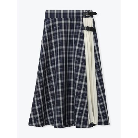 [型番:26550736845]チェック柄と配色プリーツの切り替えが目を引くミディ丈スカート。広がりすぎないフレアラインで、バランスよく取り入れやすい一枚です。コンパクトなニットやリブトップスを合わせるとウエスト周りがすっきり見え、シャツを合わせる場合は前だけインするとバックルデザインが引き立ちます。