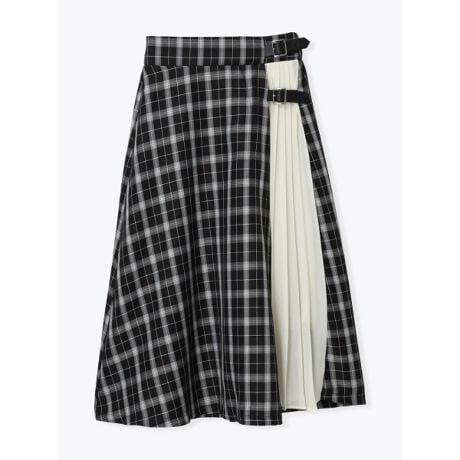 [型番:26550736845]チェック柄と配色プリーツの切り替えが目を引くミディ丈スカート。広がりすぎないフレアラインで、バランスよく取り入れやすい一枚です。コンパクトなニットやリブトップスを合わせるとウエスト周りがすっきり見え、シャツを合わせる場合は前だけインするとバックルデザインが引き立ちます。
