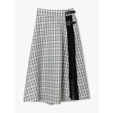 [型番:26550736845]チェック柄と配色プリーツの切り替えが目を引くミディ丈スカート。広がりすぎないフレアラインで、バランスよく取り入れやすい一枚です。コンパクトなニットやリブトップスを合わせるとウエスト周りがすっきり見え、シャツを合わせる場合は前だけインするとバックルデザインが引き立ちます。
