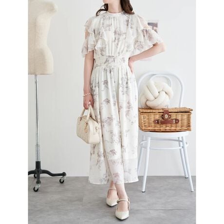 フラワーリボンフリルノースリーブワンピース