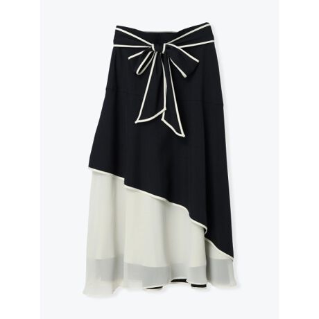 [型番:26550738560]配色パイピングとリボンデザインが目を引くスカート。ウエストのリボンでフィット感を調整でき、スタイリングのアクセントにもなる一枚です。コンパクトなニットやリブトップスを合わせるとウエスト周りがすっきり見え、ブラウスを合わせる場合は前だけインするとリボンデザインが引き立ちます。