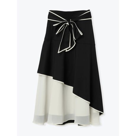 [型番:26550738560]配色パイピングとリボンデザインが目を引くスカート。ウエストのリボンでフィット感を調整でき、スタイリングのアクセントにもなる一枚です。コンパクトなニットやリブトップスを合わせるとウエスト周りがすっきり見え、ブラウスを合わせる場合は前だけインするとリボンデザインが引き立ちます。