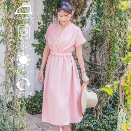 一枚でサマになるブラウジングワンピースは、ウエストマークで上品見え。