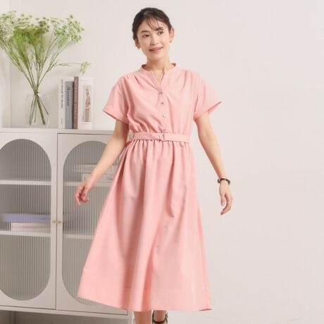 一枚でサマになるブラウジングワンピースは、ウエストマークで上品見え。