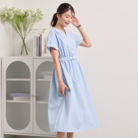 一枚でサマになるブラウジングワンピースは、ウエストマークで上品見え。