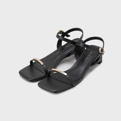 華奢ストラップにゴールドバーがきらりと映えるミニマルサンダル。