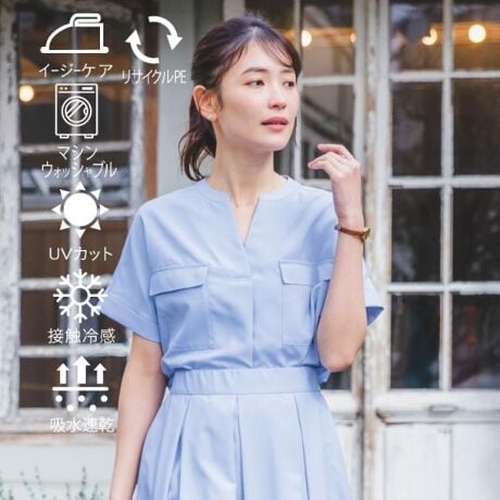 きちんと感あるスキッパーデザインに程よくカジュアルなエッセンスをプラスする胸元ポケットが新鮮。
