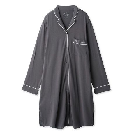 コットン混で柔らかく、伸縮性が良いカットソーを使用したマタニティシリーズです。ベーシックなシャツ型に、品のある配色パイピングを効かせたマタニティワンピース。ソフトな素材感と締め付け感のないふんわりとしたシルエットで、バスト部分はスナップボタンの仕様で楽に開け閉めが可能です。産前〜産後の授乳時期まで長く愛用していただけます。また両脇にポケットと、家事がしやすいように袖がまくれるようにタブも付いています。胸元にはワンポイントでさりげなくロゴ刺繍を入れました。色は柔らかいピンクと落ち着きのあるチャコールグレーの2色をご用意。同素材のレギンスを合わせて、セットアップで入院着にしていただくのもおすすめです。