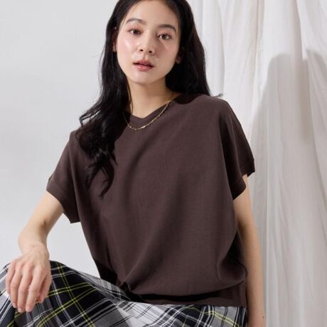 浅めのVネックが顔まわりにほどよい抜け感を与える、大人のフレンチスリーブニットトップス。