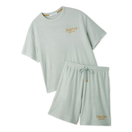 落ち着きある配色に、ワンポイントの筆記体ロゴ刺繍を添えた、USAGI ONLINE限定のHOMMEセットアップです。肌にひんやりと涼しく感じる接触冷感と、UVカットを備えた夏にうれしい機能素材を使用したベーシックなTシャツとポケット付きハーフパンツの組み合わせ。汗ばむ時期のお風呂上がりや、旅先でリラックスしたいときにもおすすめのアイテムです。色は落ち着きのあるベージュ、ミント、ダークグレー、ネイビーをご用意。シンプルで飽きのこないデザインでギフトにもおすすめです。