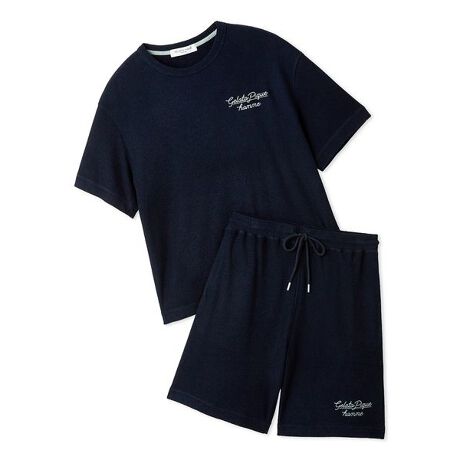 落ち着きある配色に、ワンポイントの筆記体ロゴ刺繍を添えた、USAGI ONLINE限定のHOMMEセットアップです。肌にひんやりと涼しく感じる接触冷感と、UVカットを備えた夏にうれしい機能素材を使用したベーシックなTシャツとポケット付きハーフパンツの組み合わせ。汗ばむ時期のお風呂上がりや、旅先でリラックスしたいときにもおすすめのアイテムです。色は落ち着きのあるベージュ、ミント、ダークグレー、ネイビーをご用意。シンプルで飽きのこないデザインでギフトにもおすすめです。