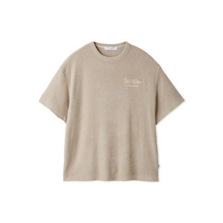 肌に涼しい接触冷感と、UVカット機能を備えた夏らしいパイル素材のシリーズです。お風呂上がりなどにゆるっと着用していただけるプルオーバー。胸元の筆記体ロゴと、ネックラインの内側にあしらった配色デザインをさりげなくリンクさせた、ミニマルなデザインがポイントです。リラックスしたシーンにも重宝する1枚。色はベージュ、ミント、ネイビーとONLINE限定カラーのダークグレーをご用意しました。同シリーズのハーフパンツやハットと組み合わせてお楽しみいただけます。