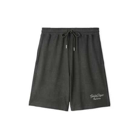 肌に涼しい接触冷感と、UVカット機能を備えた夏らしいパイル素材のシリーズです。ポケット付きのベーシックなシルエットで仕上げたハーフパンツ。左裾に入れた筆記体ロゴと、紐先のアグレットにあしらった配色デザインをさりげなくリンクさせた、ミニマルなデザインがポイントです。リラックスしたシーンにも重宝する1枚。色はベージュ、ミント、ネイビーとONLINE限定カラーのダークグレーをご用意しました。同シリーズのTシャツやパーカと組み合わせてお楽しみいただけます。