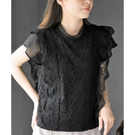 プチハイネックフレンチスリーブレースブラウス