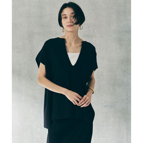 ■デザインゆったりとしたフォルムのニットジレ。フロントは深めにあいたキーネックで、どんなインナーとも合わせやすいのもポイント。キャミソールやタンクトップと合わせると、ベストとしてもご着用いただけます。前後差のあるヘムラインで、抜け感をプラスしてくれます。ボトムを選ばないミドルレングスで、コーデにプラスするだけでサマになるアイテムです。