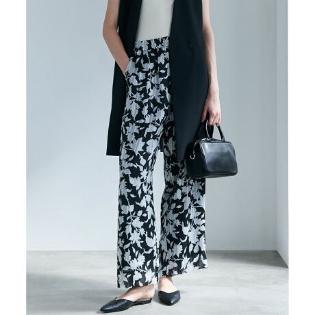 ■デザイン過去にICBで好評だったフラワープリントをきれい目ワイドパンツに落とし込んだ、新しい着映えボトムです。ウエストはゴム仕様で、ラクな履き心地なのも嬉しいポイント。華やかさと程よい光沢、シアー感が特徴で、夏に向けてシンプルになりがちなコーディネートをブラッシュアップしてくれる、存在感のある一枚です。