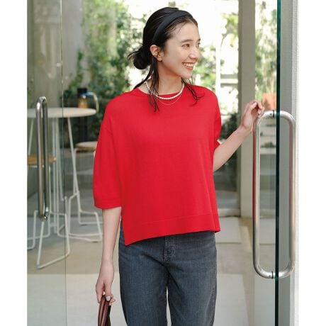 ■デザインクロップド丈のボクシーシルエットでこなれ感を演出するニット。前後差をつけたヘムラインとサイドスリットでどんなボトムとも合わせやすい万能トップスです。肘まである袖丈で、晩夏から秋まで着用いただけます。