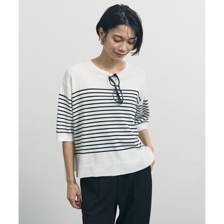 ■デザインクロップド丈のボクシーシルエットでこなれ感を演出するニット。前後差をつけたヘムラインとサイドスリットでどんなボトムとも合わせやすい万能トップスです。肘まである袖丈で、晩夏から秋まで着用いただけます。