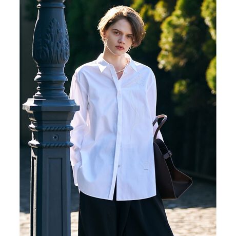 ■デザイン適度にゆとりのあるベーシックなシャツに、ICBオリジナルの刺?を施しました。刺?モチーフは白のアイリスです。花言葉である『あなたを大切にします』という、これまでもこれからも変わらないお客様への感謝の気持ちが込められています。一筆で描かれた流れるようなライン刺?は、余計な装飾をそぎ落としたPARISらしいミニマルな美しさを表現しています。刺繍特有の立体感がほどよい存在感を生み、シンプルなのにどこか印象に残るデザインに仕上げました。前身頃の左側下部分には、ICBが立ち上がった5都市(NEW YORK・TOKYO・LONDON・MILANO・PARIS)の刺繍を入れるなど、ICBらしいデザインに拘っています。単品使いはもちろん、ジャケットや羽織りのインナーとしても、幅広いコーディネートでお楽しみいただけます。