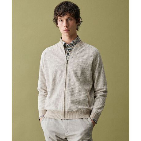 2種類の糸を使用し、丁寧にジャカード編みで仕上げたニットブルゾンです。麻ニット特有のお手入れの難しさや着崩れがなく、驚くほどの軽さを実現しました。夏の羽織りとして快適にお召しいただけるデザインです。