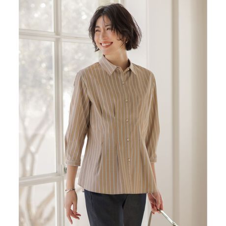 ■デザインウエストに施したタックディテールが女性らしいシルエットの、洗練されたシャツブラウス。前後にあしらったタックとサイドラインが、着るだけできれいなウエストシルエットを作ります。シンプルながらもデザイン性と女性らしさをあわせ持った、1枚でコーディネートが決まるアイテムです。袖口には逆ボックスタックを入れた7分袖で、サッとたくし上げるだけでこなれた印象に。寒い時期にはニットやスウェットとのレイヤードスタイルも楽しめるアイテムです。カラーは、洗練された印象のチャコールストライプ(#104)、肌なじみが良くやさしい印象のモカストライプ(#130)、知的な印象を与えるブルーストライプ(#170)の3色展開です。