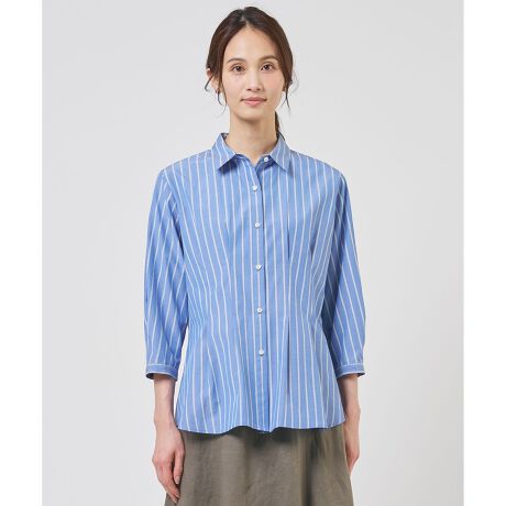 ■デザインウエストに施したタックディテールが女性らしいシルエットの、洗練されたシャツブラウス。前後にあしらったタックとサイドラインが、着るだけできれいなウエストシルエットを作ります。シンプルながらもデザイン性と女性らしさをあわせ持った、1枚でコーディネートが決まるアイテムです。袖口には逆ボックスタックを入れた7分袖で、サッとたくし上げるだけでこなれた印象に。寒い時期にはニットやスウェットとのレイヤードスタイルも楽しめるアイテムです。カラーは、洗練された印象のチャコールストライプ(#104)、肌なじみが良くやさしい印象のモカストライプ(#130)、知的な印象を与えるブルーストライプ(#170)の3色展開です。